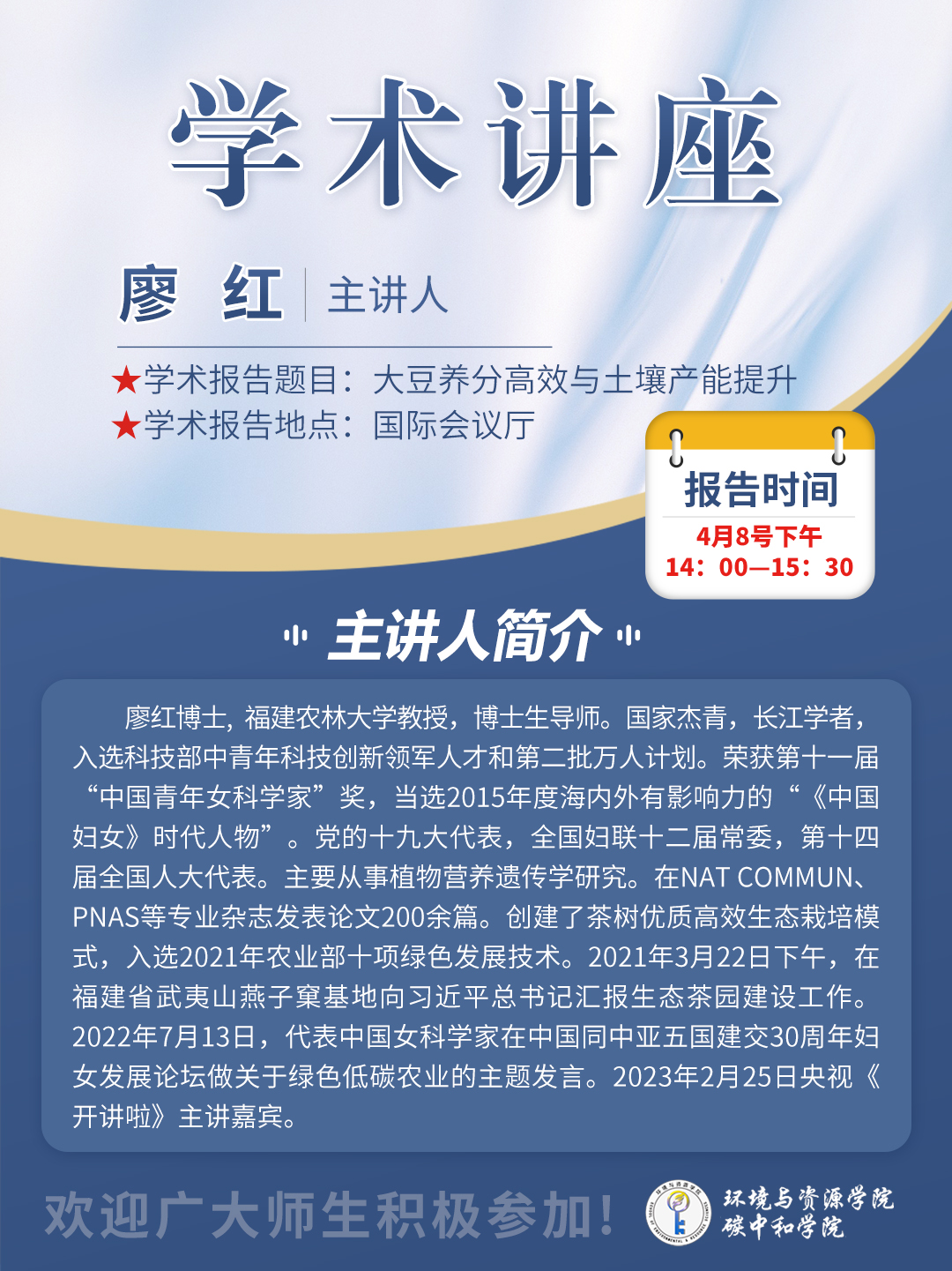 廖红博士,福建农林大学教授,博士生导师。国家杰青,长江学者,入选科技部中青年科技创新领军人才和第二批万人计划。荣获第十一届“中国青年女科学家”奖,当选2015年度海内外有影响力的“《中国妇女》时代人物”。党的十九大代表,全国妇联十二届常委,第十四届全国人大代表。主要从事植物营养遗传学研究。在Nat Commun、PNAS等专业杂志发表论文200余篇。创建了茶树优质高效生态栽培模式,入选2021年农业部十项绿色发展技术。2021年3月22日下午,在福建省武夷山燕子窠基地向习近平总书记汇报生态茶园建设工作。2022年7月13日,代表中国女科学家在中国同中亚五国建交30周年妇女发展论坛做关于绿色低碳农业的主题发言。2023年2月25日央视《开讲啦》主讲嘉宾。