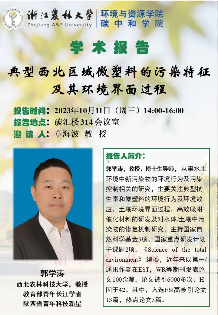 郭学涛:男,博士,教授、博士生导师。入选教育部青年长江学者,陕西省青年科技新星。主要从事水土环境中新污染物的环境行为及污染控制相关的研究,主要关注典型抗生素和微塑料的环境行为及环境效应,土壤环境界面过程,高效吸附催化材料的研发及对水体/土壤中污染物的修复机制研究。主持国家自然科学基金3项,国家重点研发计划子课题2项,近年来以第一/通讯作者在EST,WR等期刊发表论文100余篇,论文被引6000多次,H因子42。入选ESI高被引论文13篇,热点论文3篇。