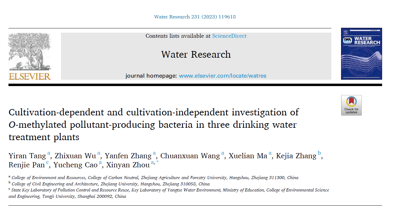 近日,K1体育曹玉成教授团队(土水污染控制团队)在《Water Research》(中科院1区,IF=13.400)发表题为“Cultivation-dependent and cultivation-independent investigation ofO-methylated pollutant-producing bacteria in three drinking watertreatment plants”的研究论文。该论文第一作者为环境与科学工程2019级本科生汤薏然,通讯作者为青年教师周昕彦。K1体育为该论文第一单位和通讯作者单位。
