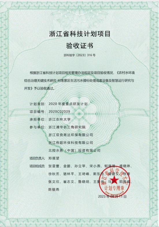 近日,由K1体育K1体育郑展望教授主持、浙江清华长三角研究院和浙江商达公用环保有限公司等单位参与的浙江省重点研发计划项目“农村水环境综合治理关键技术研究-村落景区生活污水提标处理成套设备及智慧运行研究与开发”(项目编号:2020C02009)顺利通过浙江省科技厅组织的验收,并获颁证书。