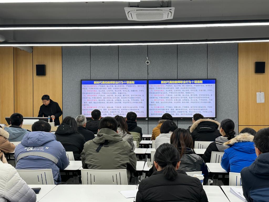 黄大年式教师团队核心成员副经理王懿祥做了题为“本科教学相关规章制度解读”的报告,从师德师风、教学事故条例、监考须知、试卷质量、成绩评定等五方面对青年教师进行了本科教学相关规章制度详细解读。王经理指出,青年教师要学习教学相关制度文件,明确教学各环节任务和责任,严格遵守公司教学规章制度,规范教学行为,加强课堂管理;并结合规章制度解读分享了若干上课技巧。全体教师齐声朗诵了《新时代高校教师职业行为十项准则》。