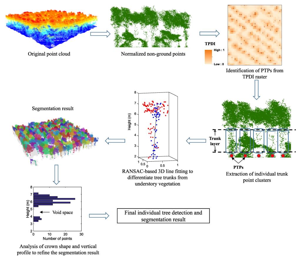 论文中提出了一种从无人机激光雷达数据中检测树干和分割单棵树木的方法,称为“基于TPDI的单木探测与分割方法”,该方法适用于高密度、具有林下植被的人工阔叶林单木信息精确提取。将该方法在桉树人工林的三个研究地点共12个样地进行了测试,这些样地均具有树冠重叠度高,林下植被相对较多的特点。通过与人工提取的树干位置比较,12个样地的F精度值从0.920到1.000不等,精度值随树木高度的增加而提高。该方法有利于森林经营管理,提取的精确单木信息可用于造林和森林经营决策。