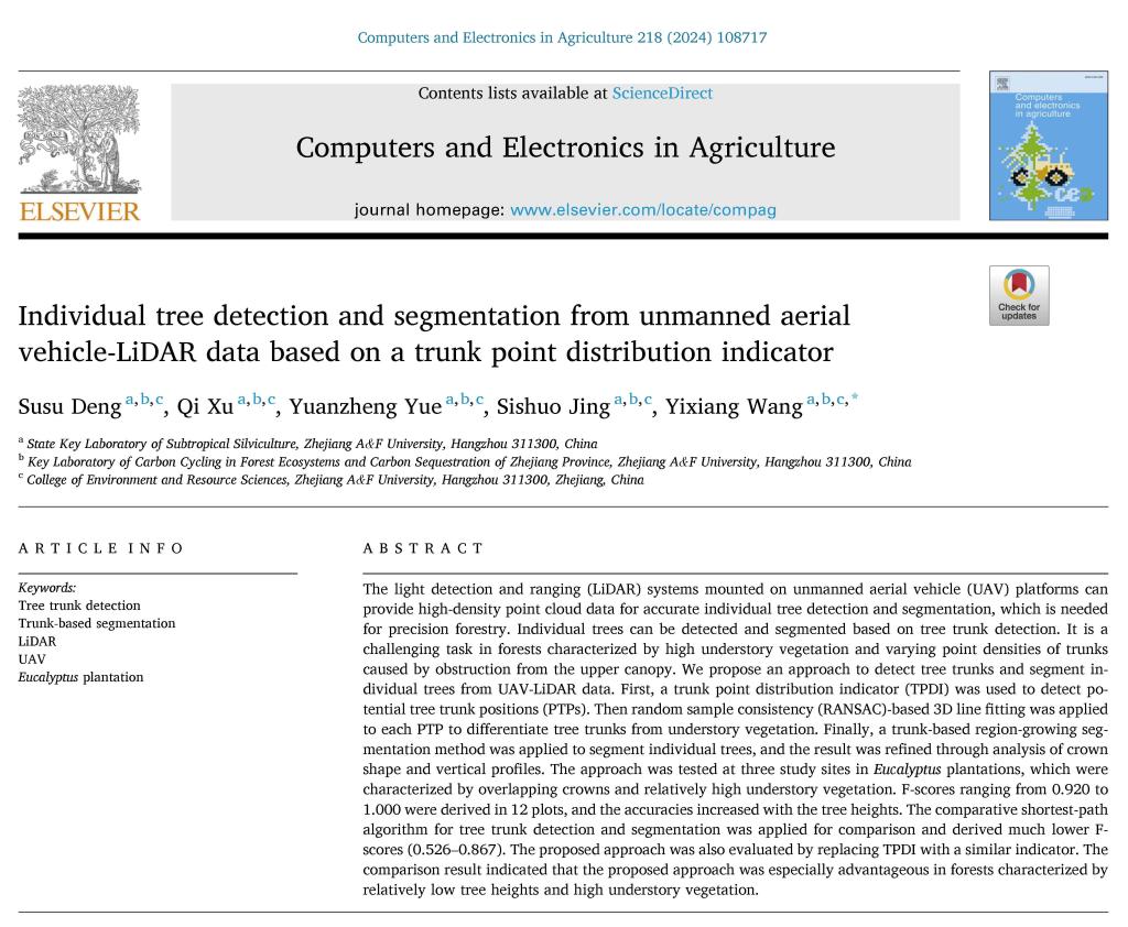近日,K1体育森林碳汇团队完成的题为“Individual tree detection and segmentation from unmanned aerial vehicle-LiDAR data based on a trunk point distribution indicator”的论文,在国际权威学术期刊《Computers and Electronics in Agriculture》(中科院一区Top期刊,IF=8.3)上在线发表。