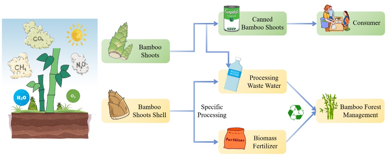 雷竹(Phyllostachys violascens)原产于中国浙江、安徽等省,以出苗期早、产量高、笋期长、营养价值高而著称。雷竹笋具有重要经济价值在国内外市场上广受欢迎、具有广阔的市场前景。雷竹笋被广泛应用于食品加工业,加工过程产生固体废物如竹笋壳和液体废水。本文基于田间实验与调查对雷竹笋加工过程中温室气体排放、碳足迹和水足迹进行研究。结果表明,加工过程导致竹笋壳自然分解过程中甲烷排放量增加了8.6%(P<0.05),二氧化碳排放量显著增加了19.7%(P<0.01),氧化亚氮排放量减少了37.9%(P<0.01),并采用回归分析方法建立中CH4、CO2和N2O排放通量与温度和湿度的关系模型,CH4和CO2排放通量与温度和湿度之间存在特定的函数关系,但N2O排放通量与环境温度、湿度无显著相关(R2<0.3);对加工废水的pH、SS、COD、NH3-N等污水指标测定,揭示了加工过程潜在的水污染;基于生命周期评估方法(LCA),系统评估生产1 kg雷竹笋罐头的二氧化碳排放量和耗水量,涵盖了竹笋产品生命周期的各个过程。评估竹笋食品加工各阶段碳、水足迹,行业利益相关者可以利用碳、水排放数据改进生产工艺,减少碳水排放,获得竞争优势,促进清洁生产和节能减排。该研究引入的竹笋食品加工生命周期体系,可以为竹笋食品加工工厂提供科学依据和技术支撑,推动行业向更加环保、可持续的方向发展。