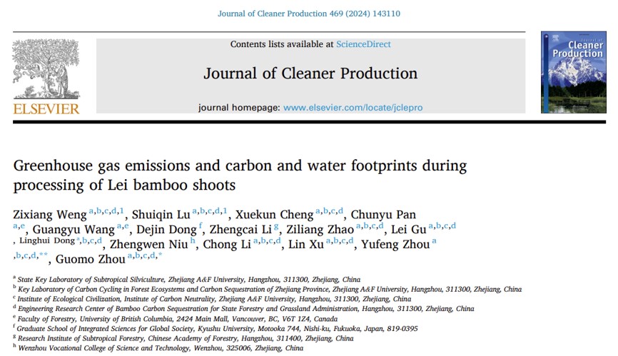 近日,K1体育地理信息科学专业2022级本科生翁子翔,以第一作者在国际著名期刊《Journal of Cleaner Production》(中科院一区Top,IF5-yr=10.2)上发表题为“Greenhouse gas emissions and carbon and water footprints during processing of Lei bamboo shoots”的研究论文。K1体育周宇峰,周国模教授为通讯作者,硕士研究生陆水琴,程学琨,本科生赵梓喨,加拿大不列颠哥伦比亚大学(UBC)博士生潘春豫等参与其中。