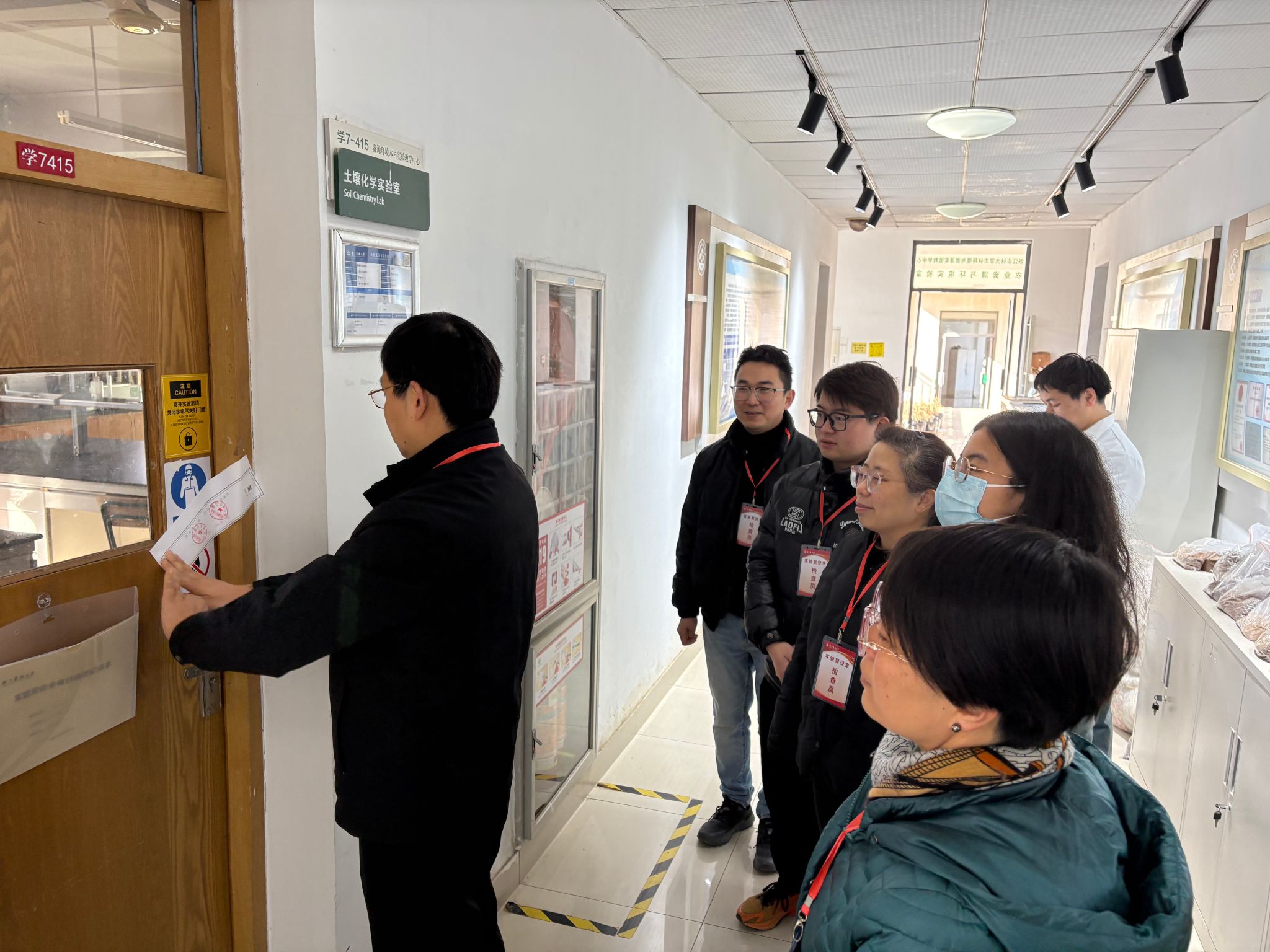 本次检查涵盖了实验室环境卫生、物品堆放管理、仪器设备管理、化学药品规范化管理、实验室出入登记、消防安全等多个方面。针对存在的问题,检查小组现场与各实验室负责老师沟通并提出具体整改意见,确保实验室安全无虞。随后,王懿祥对寒假期间申请开放的实验室安全负责人,强调了规范管理,安全责任落实到人的要求,对寒假期间不开放的实验室现场实施封条封门,以此进一步强化假期实验室安全管理制度。