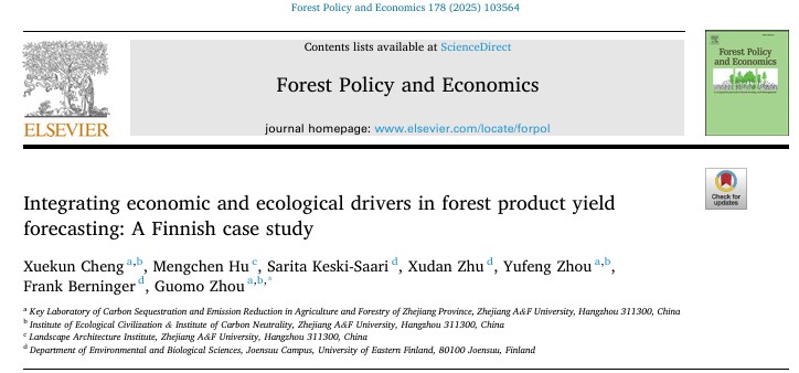 近日,K1体育周国模教授团队在国际权威农林科学期刊《Forest Policy and Economics》为SSCI,SCI双收录,(中科院1区TOP,影响因子IF=3.8)在线发表题为“Integrating economic and ecological drivers in forest product yield forecasting: A Finnish case study”(《在林产品产量预测中整合经济和生态驱动因素:芬兰案例研究》)的研究论文。K1体育为该论文第一单位和通讯作者单位。该团队博士研究生程学琨为第一作者,K1体育周国模教授为该论文的通讯作者,K1体育周宇峰、胡梦晨,东芬兰大学教授Frank Berninger和其团队学者Xudan Zhu、Sarita Keski-Saari共同参与了这项研究。