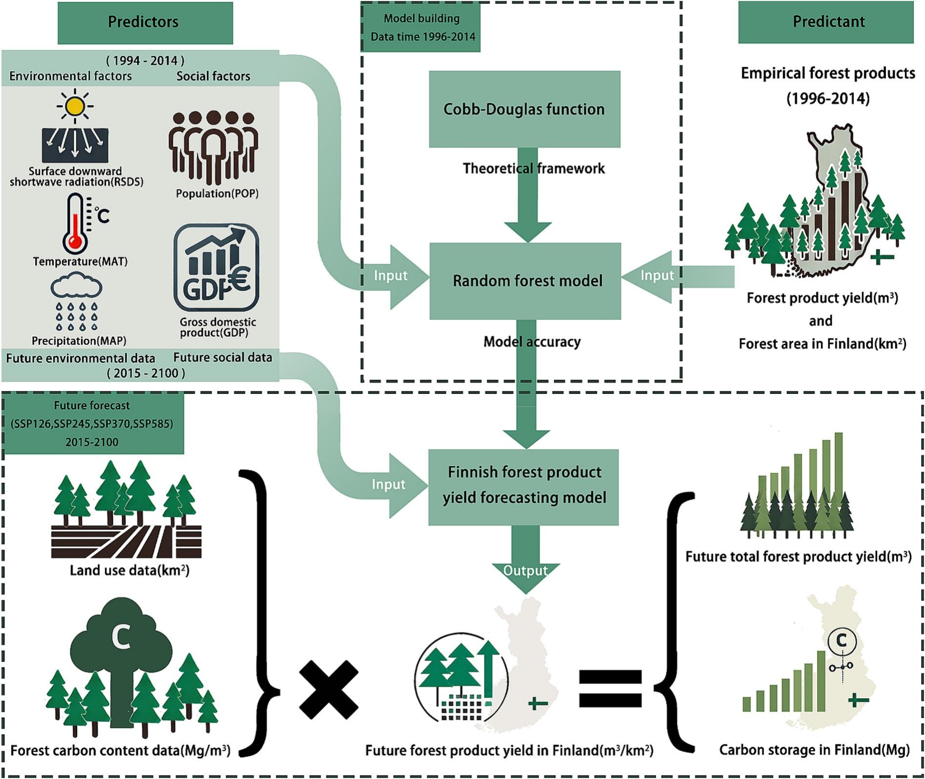 该研究创新性地融合经济与生态变量,提出了基于Cobb-Douglas函数与随机森林相结合的森林产品产量预测模型,为全球气候变化背景下的森林资源可持续管理提供了全新技术路径与决策依据。论文针对气候变化、经济发展和森林政策如何综合影响森林产品产量的问题,以森林覆盖率达75%的芬兰为研究对象,通过整合1996–2014年间的社会经济与环境数据,构建了集理论解释性与非线性拟合能力于一体的复合预测模型。研究发现,太阳辐射是影响森林产量的首要因素(占比52%),而人口与GDP等社会经济因子对森林产品产量也具有显著影响。
