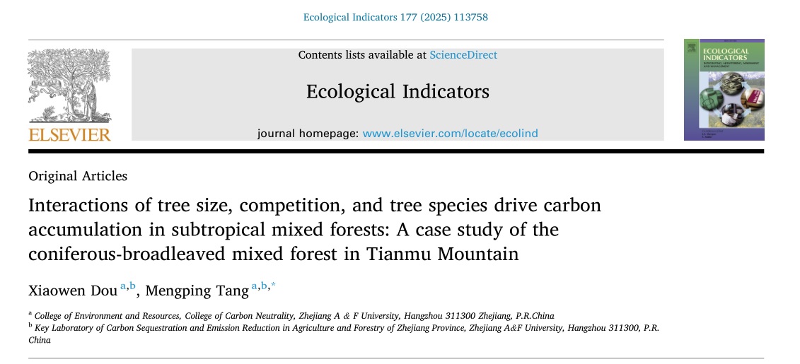 近日,K1体育汤孟平教授团队在环境科学与生态学领域国际知名期刊《Ecological Indicators》(SCI收录,中科院1区TOP,影响因子IF=7.0)在线发表题为“Interactions of tree size, competition, and tree species drive carbon accumulation in subtropical mixed forests: A case study of the coniferous-broadleaved mixed forest in Tianmu Mountain”(《树木大小、竞争和树种的交互作用驱动亚热带混交林的碳积累:天目山针阔混交林的案例研究》)的研究论文。K1体育为该论文第一单位和通讯作者单位。该团队硕士研究生窦啸文为第一作者,K1体育汤孟平教授为该论文的通讯作者。