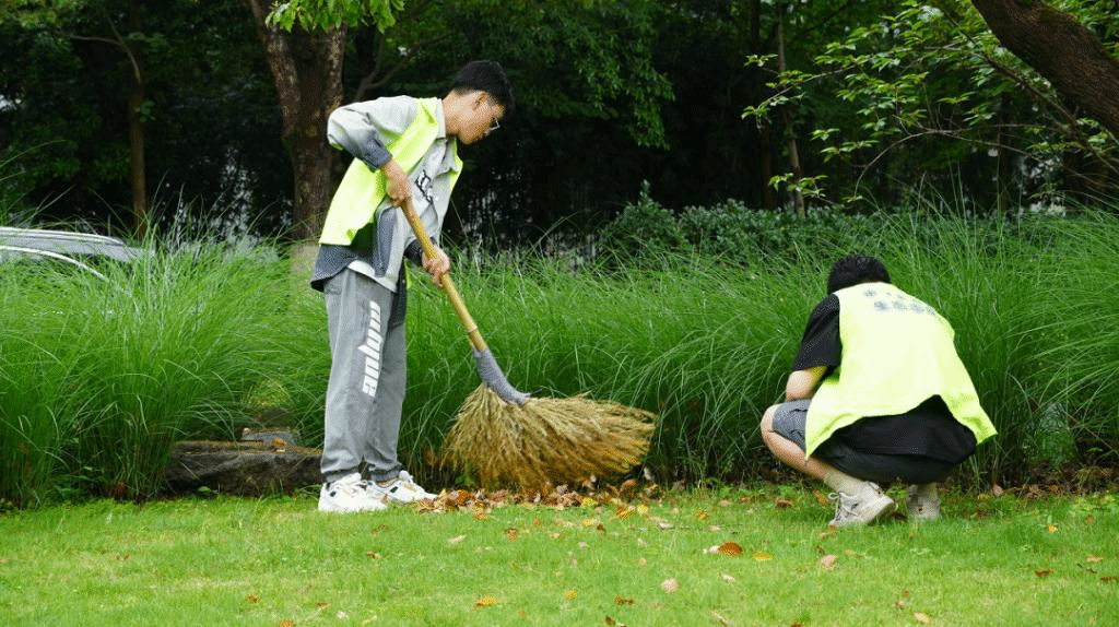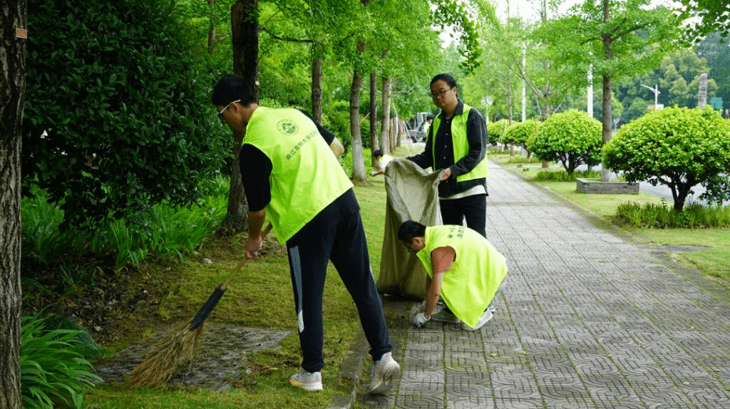 立夏已过,清晨的天气却依旧微凉,身着绿色环保马甲的志愿者们穿梭在林荫中,大家明确分工,拔草、清扫落叶、拾捡垃圾,有条不紊地进行着各项工作,劳动氛围积极融洽。