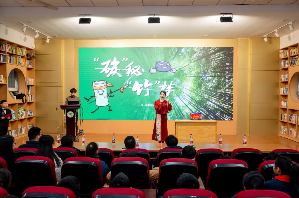 首先播放了《我是吸碳王》的中英文版版本动漫,黄玺洁同学对《“碳”秘“竹”梦》这一作品进行科普讲解,该项作品也在全国林业和草原科普讲解大赛总决赛中斩获多项大奖。同时,也介绍了公司录取通知书等特色竹制产品,引起小朋友们极大兴趣和热烈反响。