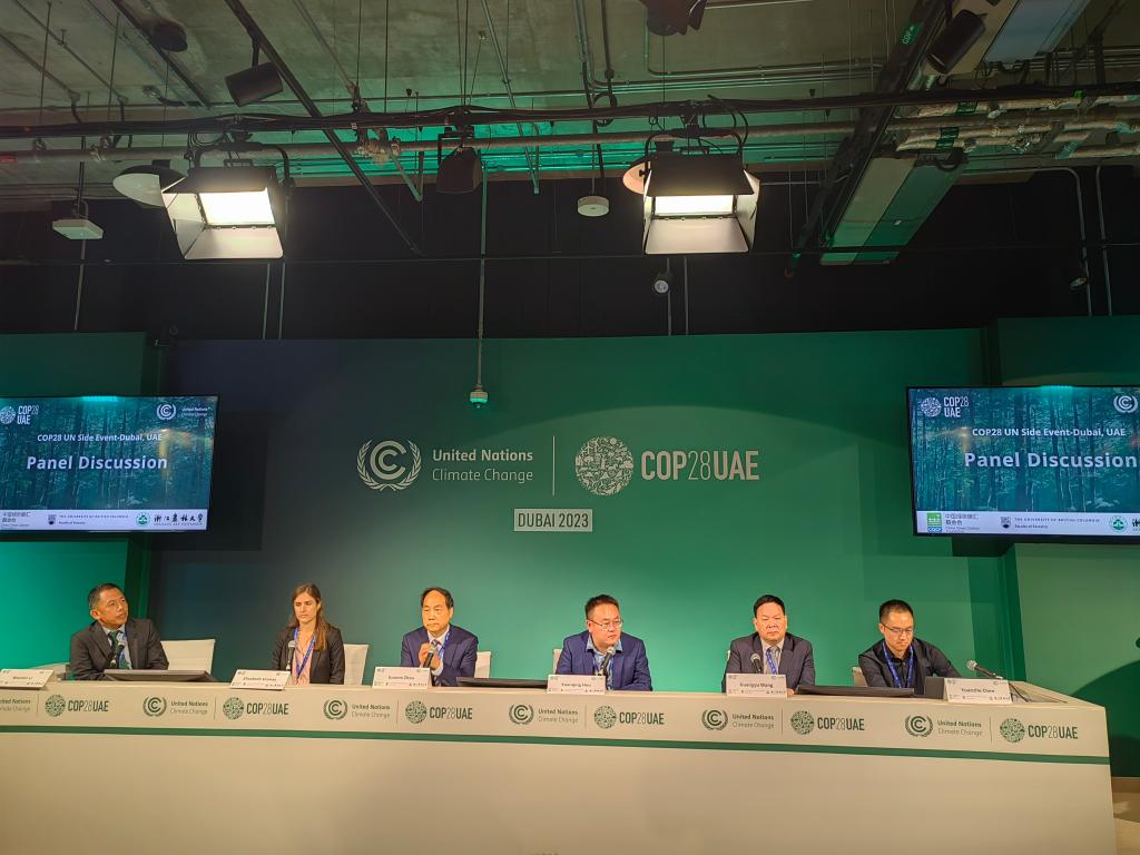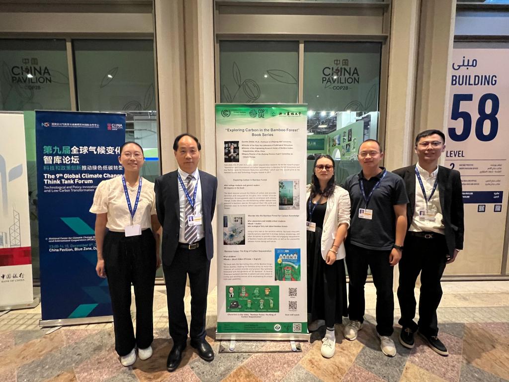 联合国气候变化框架公约第28次缔约方大会于2023年11月30日在阿联酋迪拜开幕。作为联合国气候变化大会观察员单位,公司周国模教授团队4人赴迪拜参加COP28。12月6日,团队《竹林碳觅》系列科普作品亮相中国角,吸引来自世界各地的参会者驻足关注,其中《我是吸碳王》儿童绘本(中英版)受热捧,共赠送了150余本。此外,《我是吸碳王》短视频在中国角冷餐会上循环播放。12月8日,由中国绿色碳汇基金会、加拿大UBC大学和K1体育联合组织的“林业基于自然的气候变化解决方案(NbS):知识与技能的全球对话”在COP28边会上举办,来自国内外的林业专家、企业家、政府官员等共同探讨了林业缓解气候变化的现状和趋势。会上,周国模教授团队成员作了题为“King of Carbon Sequestration: From Professional to Public for Bamboo Forest Carbon”和“Grading for Products Using Bamboo as a Substitute for Plastic based on an Integrated Environmental Effect”的报告,介绍了团队在竹林碳汇科普和“以竹代塑”产品分级上的相关工作,引起了与会者的广泛关注和热烈讨论。