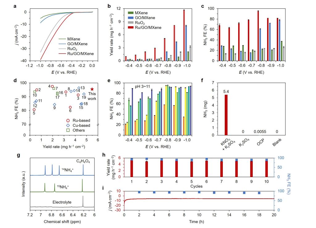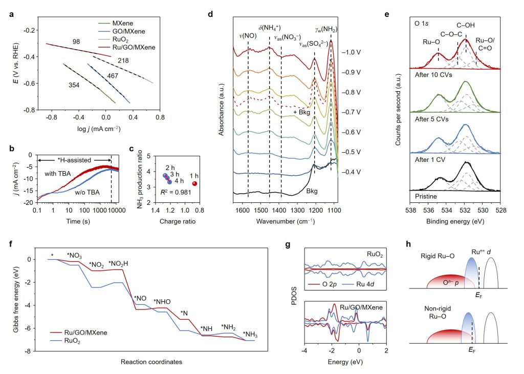研究制备的Ru/GO/MXene在−0.8 V vs. RHE时表现出卓越的NH3产率,超过5 mg h−1cm−2,实现几乎100%的NH3−法拉第效率,远远超过大多数报道的钌基催化剂材料。XPS和ATR-FTIR证实Ru/GO/MXene中的Ru−O共价键具有动态和自修复特性,这在促进硝酸根转化为氨的催化过程中起着关键作用。之后的理论研究进一步揭示了Ru−O键的非刚性以及它们如何自我调节以适应硝酸还原反应中涉及的各种中间体。这项工作提供了一种制造具有可逆和非刚性金属−氧键的高性能电催化剂的方法,为实际废水中的硝酸根电解开辟了新的可能性。