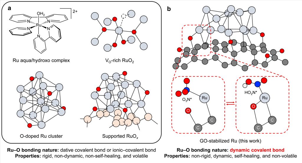 该团队设计了一种介于氧化石墨烯(GO)和支撑过渡金属(TM)之间的非刚性金属−氧键。其中纳米尺度的钌(Ru)分散在GO上,另一个二维材料MXene用于补偿GO的低电导率。GO片作为“微米级”配体通过氧化基团(主要是环氧和羟基)与TM结合。当过渡金属纳米颗粒沉积到石墨烯氧化物上时,便可形成非刚性TM–O键,牢固地限制在TM/石墨烯氧化物界面上。含氧基团能够根据反应动态与过渡金属发生关联和解离,与游离氧和羟基配体的不可逆迁移形成对比。