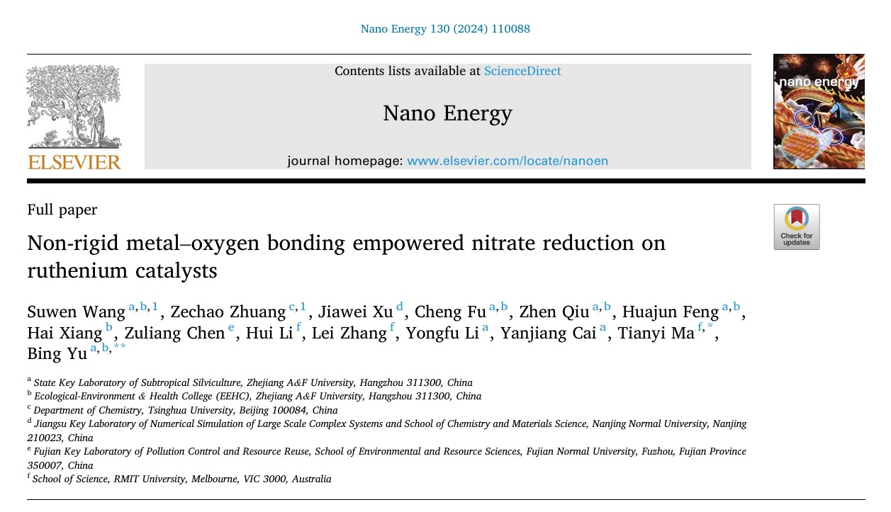 8月7日,K1体育余兵教授领衔的环境功能材料团队在国际顶尖期刊《Nano Energy》(中科院1区Top,IF=16.8)在线发表题为“Non-rigid metal–oxygen bonding empowered nitrate reduction on ruthenium catalysts”(非刚性金属−氧键增强钌催化剂的硝酸还原活性和稳定性)的研究论文。K1体育为该论文第一单位和通讯作者单位。该团队2021级硕士研究生汪素闻为第一作者,K1体育余兵教授为该论文的通讯作者。